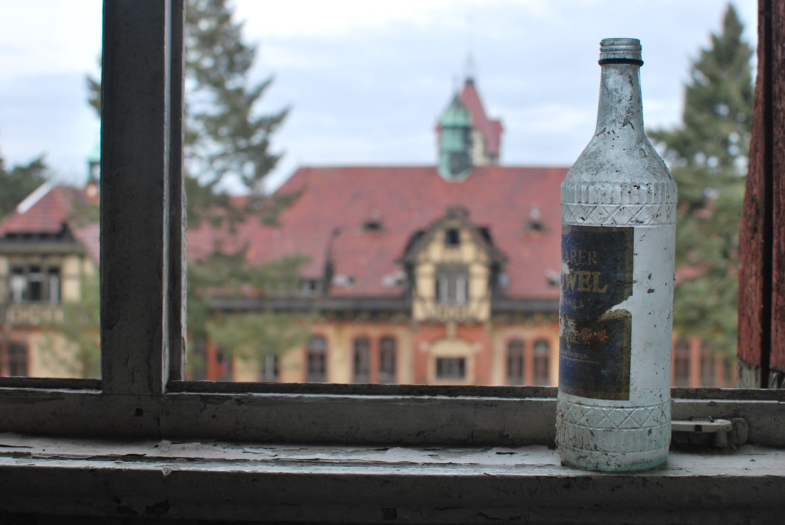 A forgotten vodka bottle overlooking the central courtyard