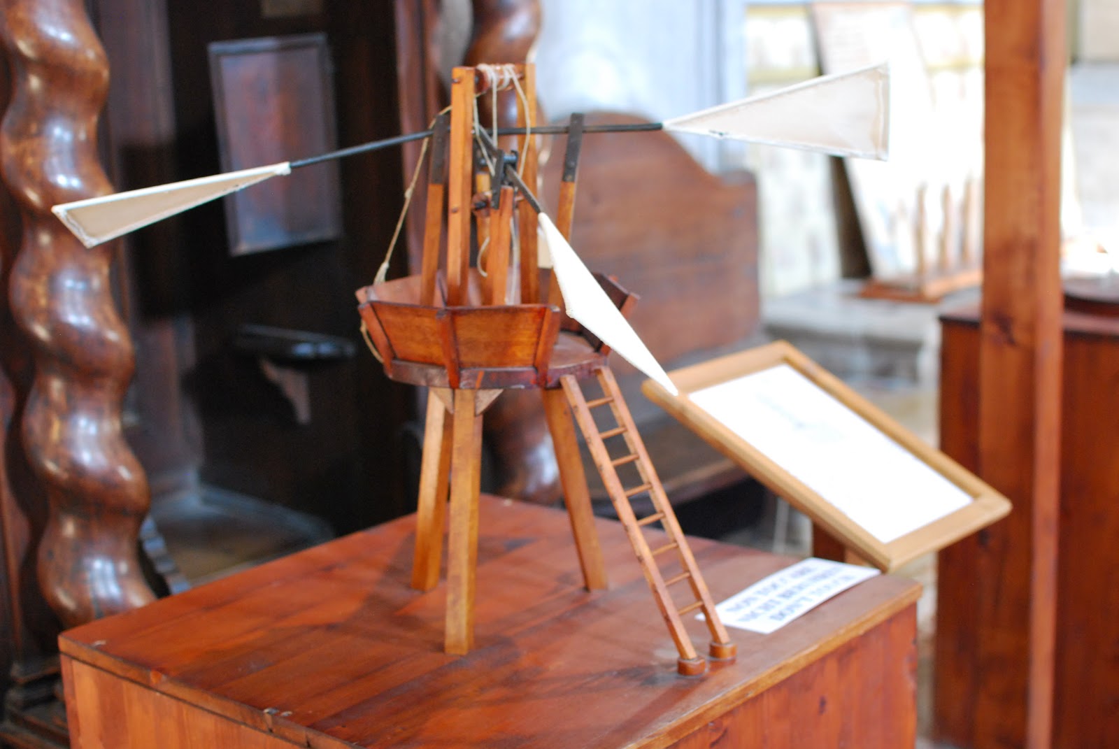 Housed inside the small Church of San Barnaba, the collection of machines made from his sketches is both intriguing and amazing. The wooden models, some of which are interactive, range from ball-bearings to bicycles to tanks  to helicopters to double-hulled boats. Each model is placed beside a reproduction of the original sketch, making it all the more interesting. In addition to the models, prints of some of his most famous sketches, sculptures, and paintings adorn the walls.